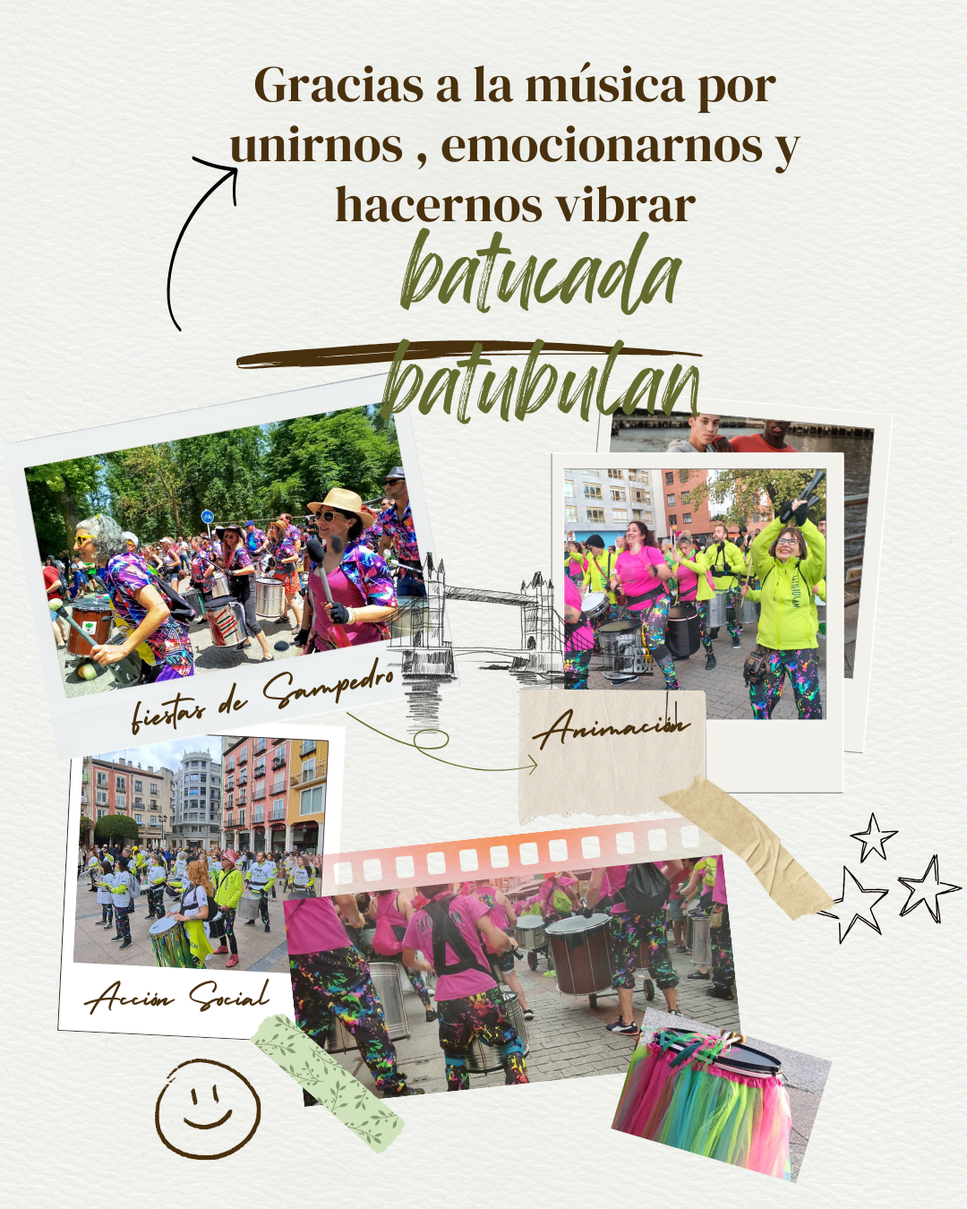 Nuestras actuaciones llenan de color, movimiento y alegría pasacalles, fiestas populares, cabalgatas, festivales y eventos culturales. Apostamos por la música como herramienta de participación social, integración y difusión cultural, llevando el pulso de la percusión a cada rincón donde actuamos.